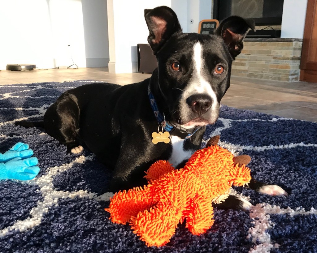 You never know what you’re going to get when you adopt a dog. Happily, Rocky has bounced back brilliantly from his rough start. He is a happy dog who loves going for walks and playing in our backyard — once we taught him how to do those things. He’s a gentle soul who loves to snuggle. He’s gotten over a lot of anxiety that he had around strange places and loud noises. He still has some anxiety but has safe places in our house he can comfortably sequester.